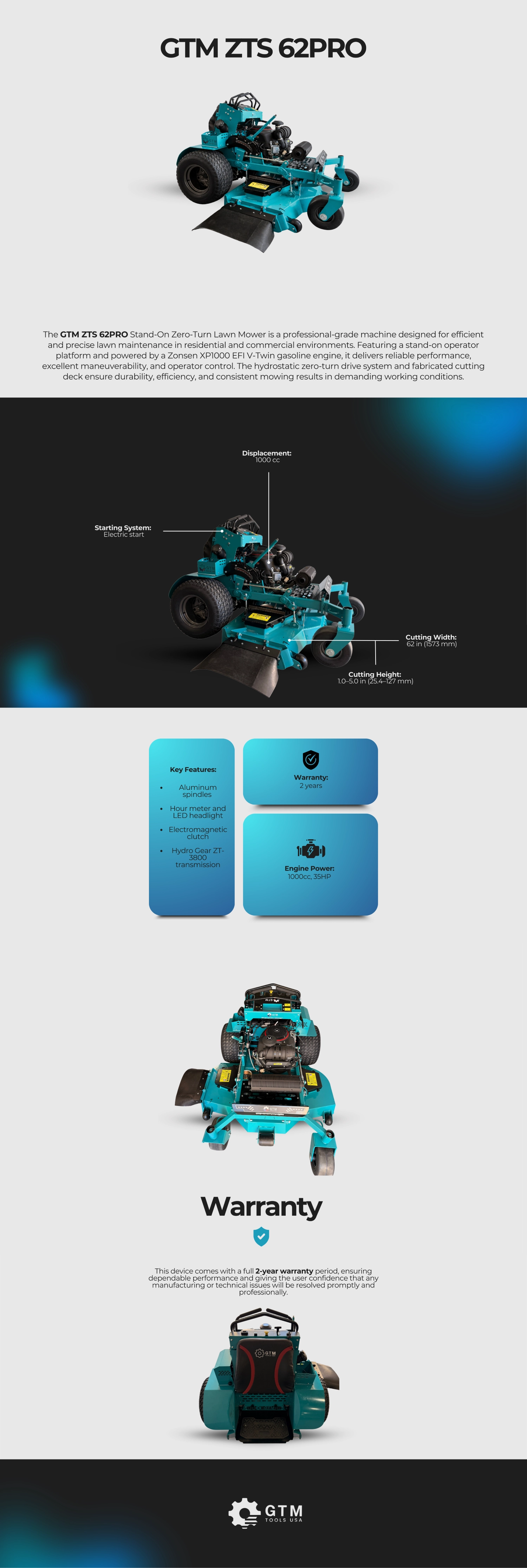 The GTM ZTS 62PRO Stand-On Zero-Turn Lawn Mower is a professional-grade machine designed for efficient and precise lawn maintenance in residential and commercial environments. Featuring a stand-on operator platform and powered by a Zonsen / Zongshen XP1000 EFI V-Twin gasoline engine, it delivers reliable performance, excellent maneuverability, and operator control. The hydrostatic zero-turn drive system and fabricated cutting deck ensure durability, efficiency, and consistent mowing results in demanding working conditions.