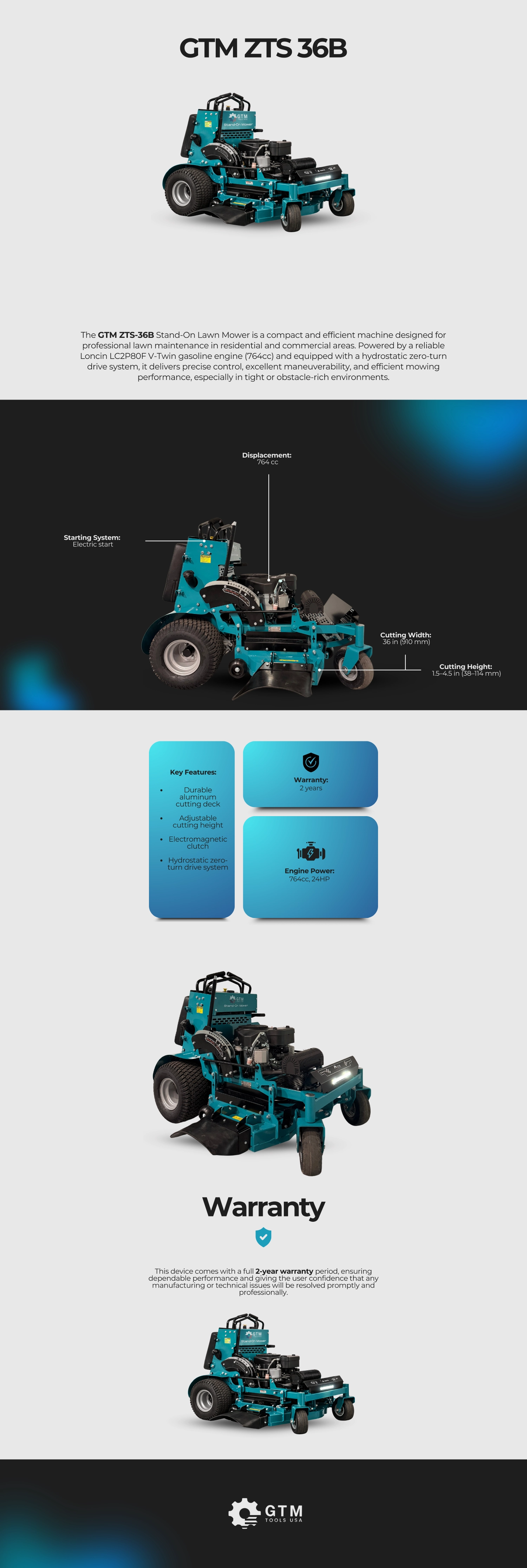 The GTM ZTS-36B Stand-On Lawn Mower is a compact and efficient machine designed for professional lawn maintenance in residential and commercial areas. Powered by a reliable Loncin LC2P80F V-Twin gasoline engine (764cc) and equipped with a hydrostatic zero-turn drive system, it delivers precise control, excellent maneuverability, and efficient mowing performance, especially in tight or obstacle-rich environments.