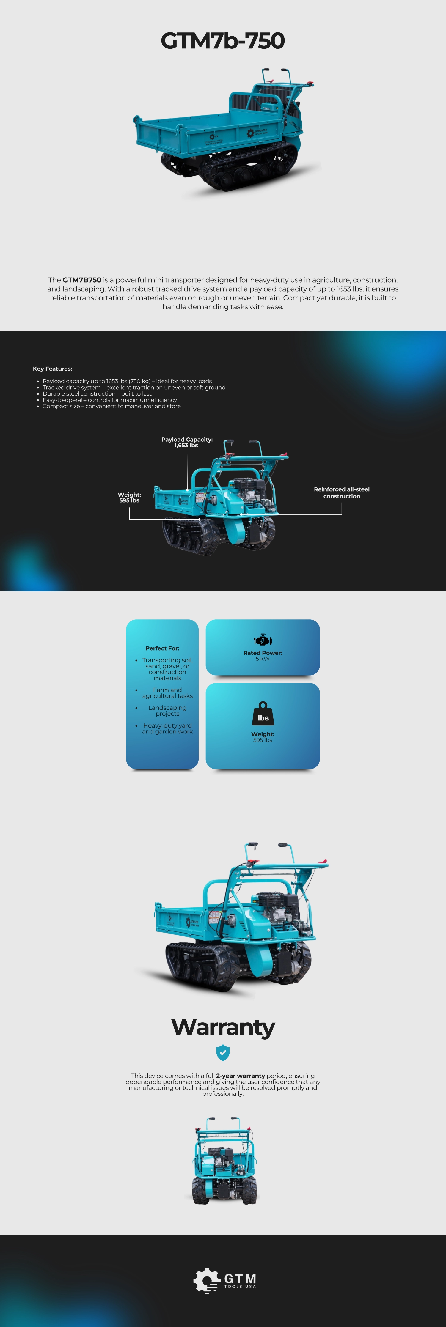 The GTM7B750 is a powerful mini transporter designed for heavy-duty use in agriculture, construction, and landscaping. With a robust tracked drive system and a payload capacity of up to 1653 lbs, it ensures reliable transportation of materials even on rough or uneven terrain. Compact yet durable, it is built to handle demanding tasks with ease.