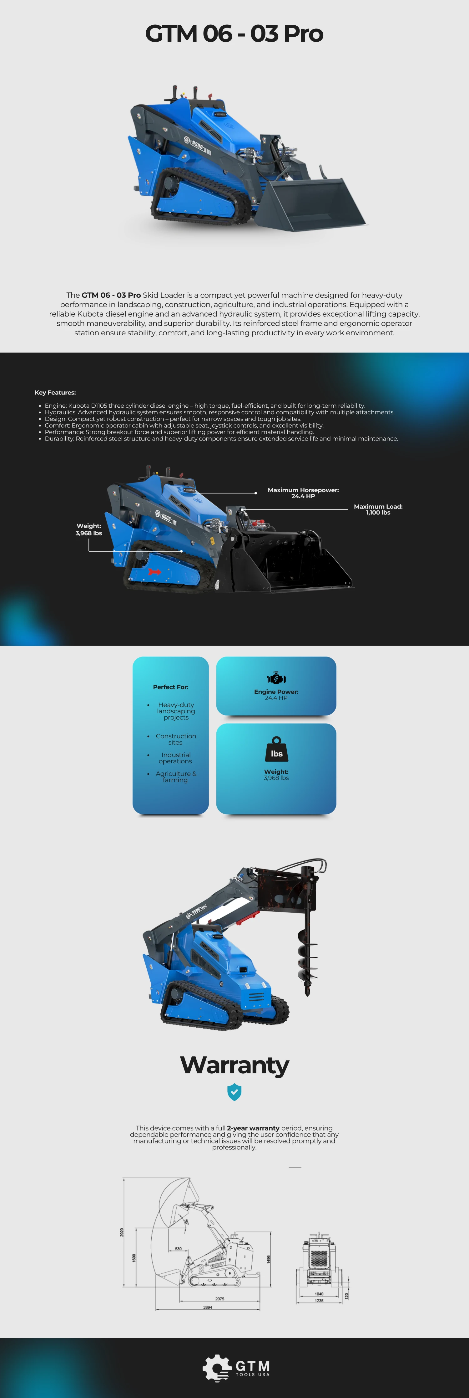 The GTM x Rippa 06 - 03 Pro is a compact yet powerful machine designed for heavy-duty performance in landscaping, construction, agriculture, and industrial operations. Equipped with a reliable Kubota diesel engine and an advanced hydraulic system, it provides exceptional lifting capacity, smooth maneuverability, and superior durability. Its reinforced steel frame and ergonomic operator station ensure stability, comfort, and long-lasting productivity in every work environment.