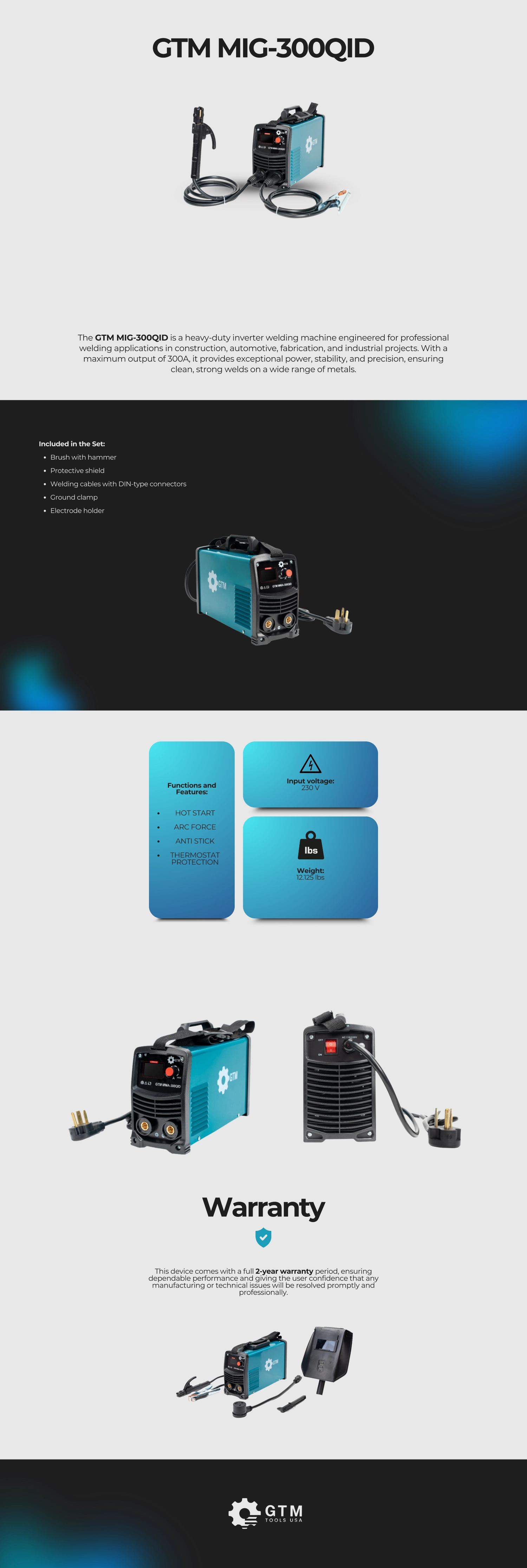 The GTM MIG-300QID is a heavy-duty inverter welding machine engineered for professional welding applications in construction, automotive, fabrication, and industrial projects. With a maximum output of 300A, it provides exceptional power, stability, and precision, ensuring clean, strong welds on a wide range of metals.